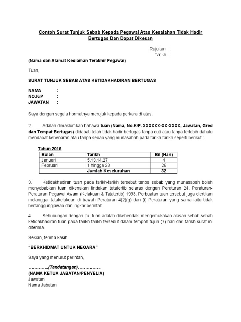 Contoh Surat Tunjuk Sebab Tidak Hadir Bertugas Kerajaan Letter 7saudara Com